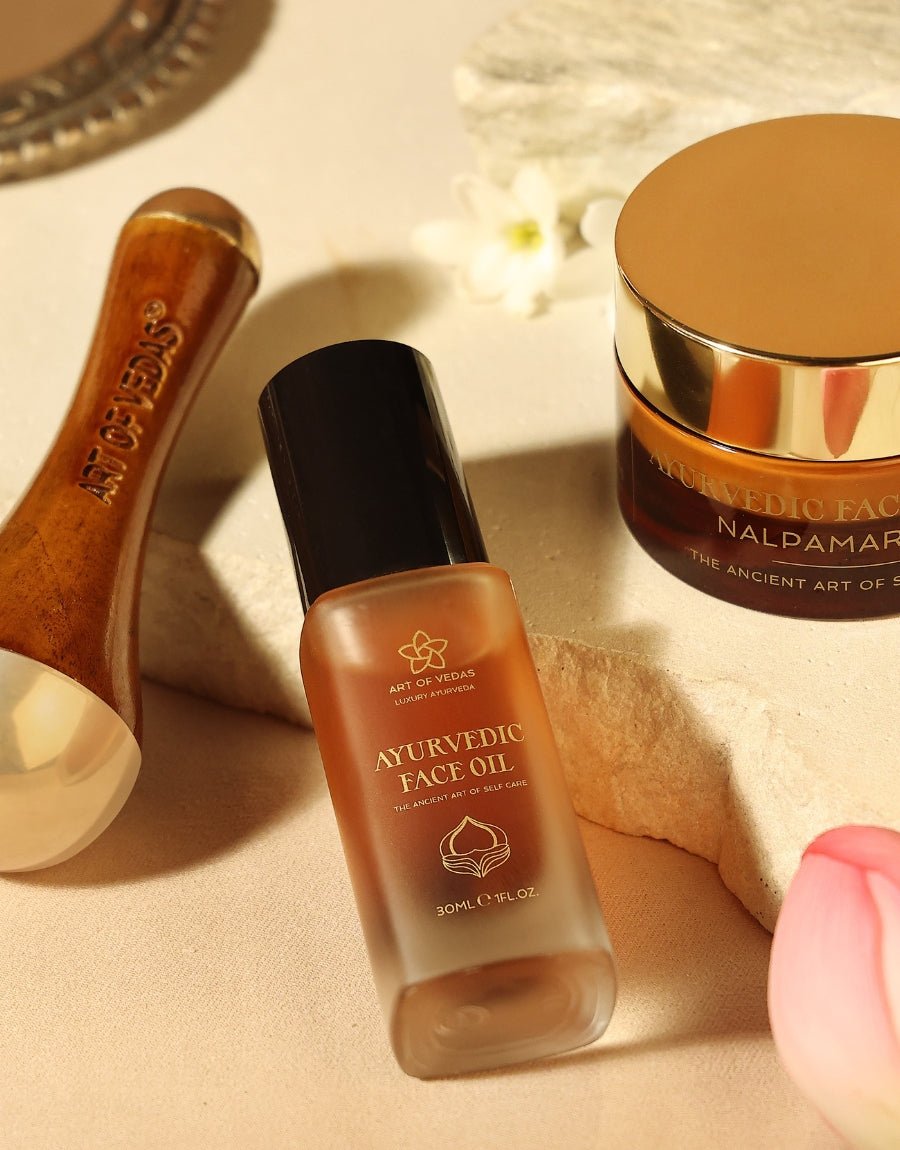 Reveal the essence of true Ayurvedic beauty with our Ayurvedic Beauty Ritual Kit, a blend of ancient tradition and mindful self-care. This thoughtfully curated set features our premium Ayurvedic Face Oil and a handcrafted Mini Kansa Wand, inspired by centuries old Ayurvedic practices.