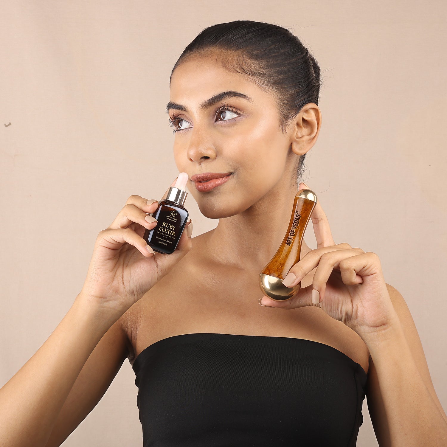 In Ayurveda, the face holds several marma points — energy centres connected to the brain, organs, and doshas. Massaging these points with the Kansa Wand, made of a sacred bronze alloy, gently clears stagnation, enhances pranic flow, and supports both emotional calm and skin vitality.