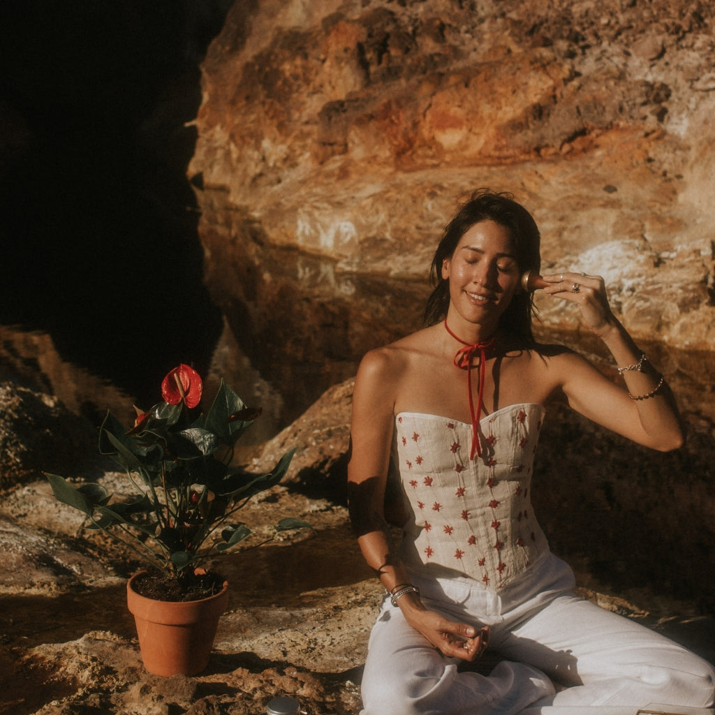 Aloita päivittäinen tai viikoittainen itsehoitorituaalisi levittämällä Kumkumadi Serum hellävaraisesti kasvoillesi ja kaulallesi. Käytä Kansa Wandia ja tee rytmikkäitä, pyöriviä liikkeitä kasvojesi marmapisteillä. Tämä perinteinen tekniikka ei ainoastaan ravitse ihoa syvästi, vaan myös harmonisoi doshat ja edistää rentoutumista.
