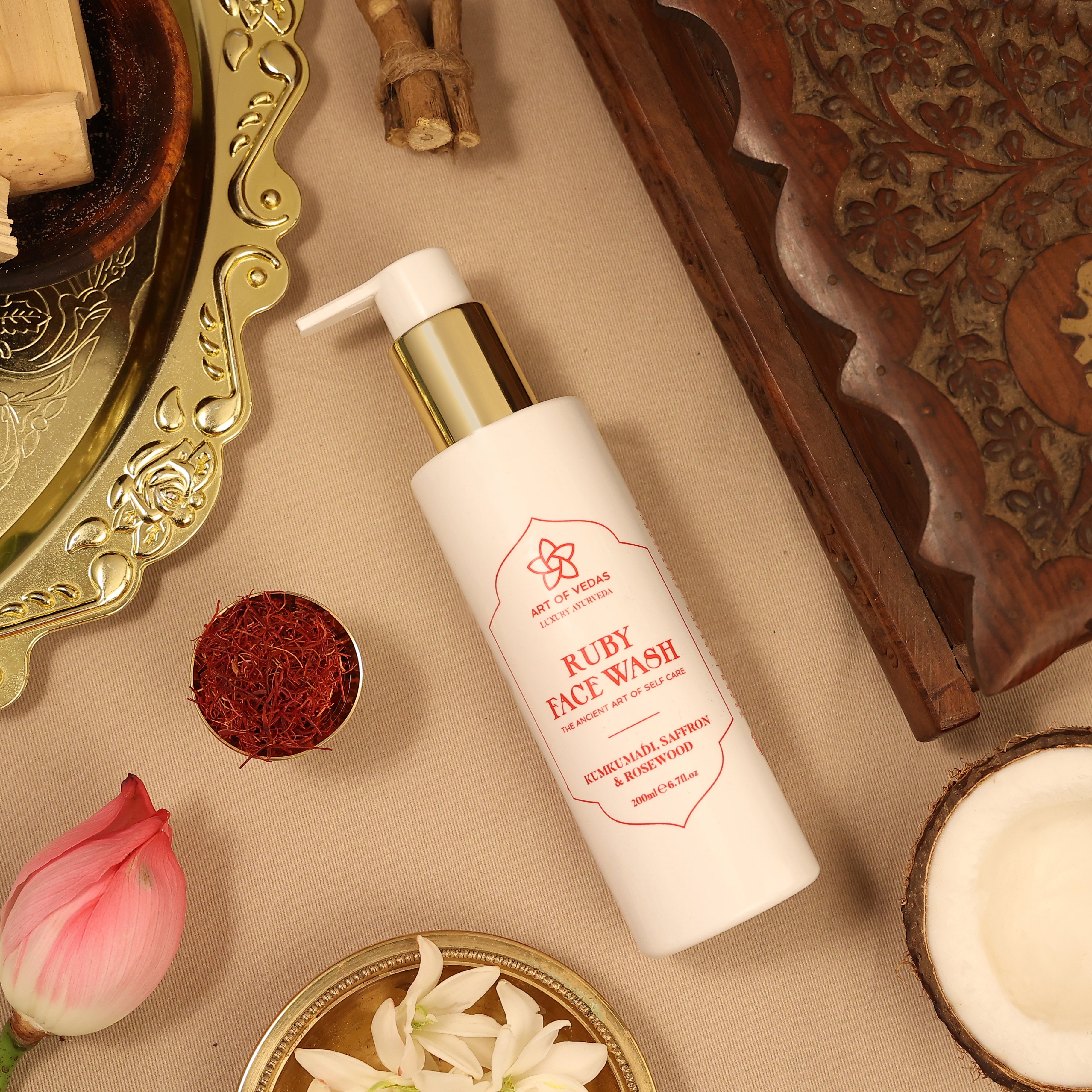 - Ruby Arctisztító (150ml): Egy gyengéd tisztító, amely Kumkumadival és sáfránnyal van dúsítva, hogy megtisztítsa a bőrt, miközben megőrzi annak természetes nedvességét és ragyogását.