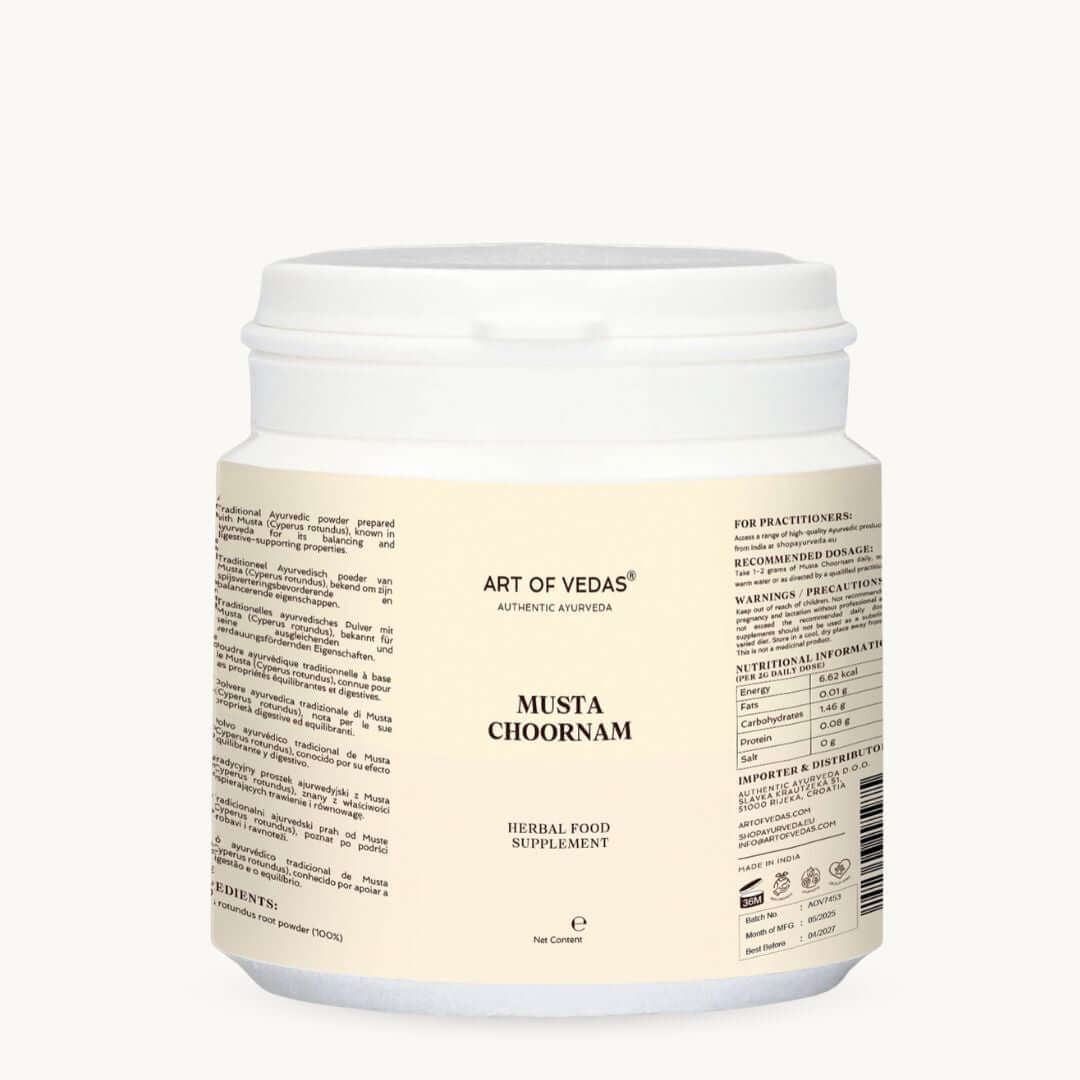 A Musta Choornam egy klasszikus ayurvédikus por, amelyet a Cyperus rotundus gyöktörzséből készítenek, egy tisztelt gyógynövényből, amely mély hatást gyakorol az emésztő tűzre (Agni) és a Pitta doshára. Hagyományosan szülés utáni ápolásra, gyermekek egészségének támogatására és Pitta állapotok kezelésére használják, ez egy gyengéd és hatékony készítmény, amelyet a klasszikus ayurvédikus módszerek szerint állítanak elő.